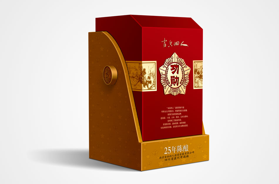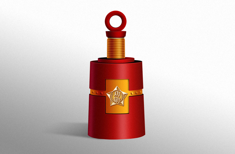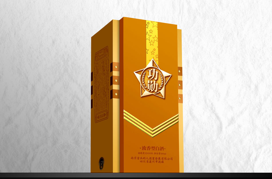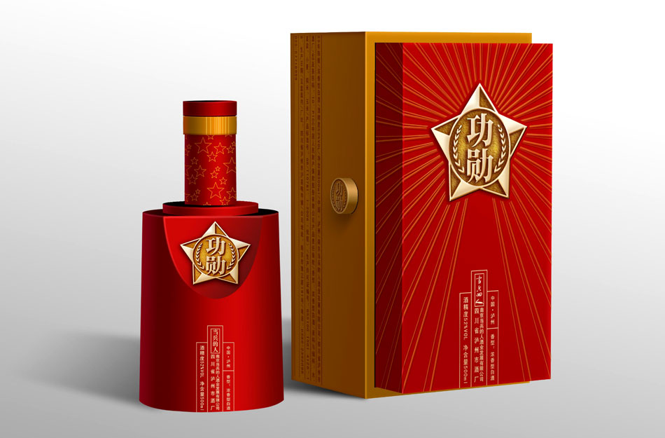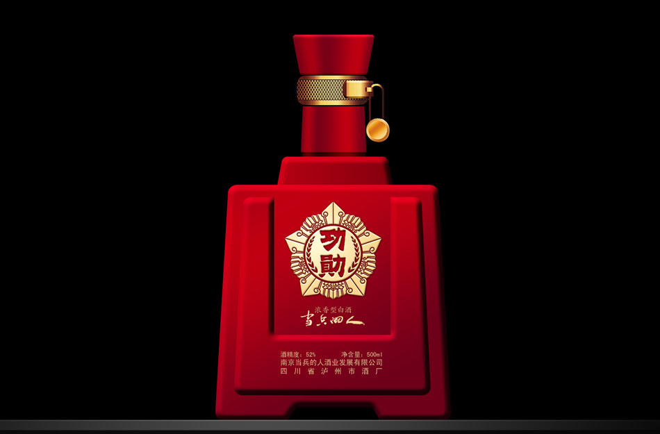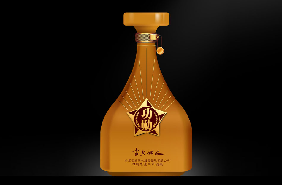 酒瓶創意:用軍人最熟悉的、最常用且最富有感情的軍用水壺及手榴彈二元素作創意突破點。包裝創意:以軍星“功勛”酒標為主題,引用中國軍人近代自豪的幾次著名戰役為興奮劑, 南昌起義, 或平型關大捷, 或百團大戰, 或抗美援朝, 或抗震, 或抗洪等 外包裝結構造型獨特。高檔級與中檔級酒包裝設計